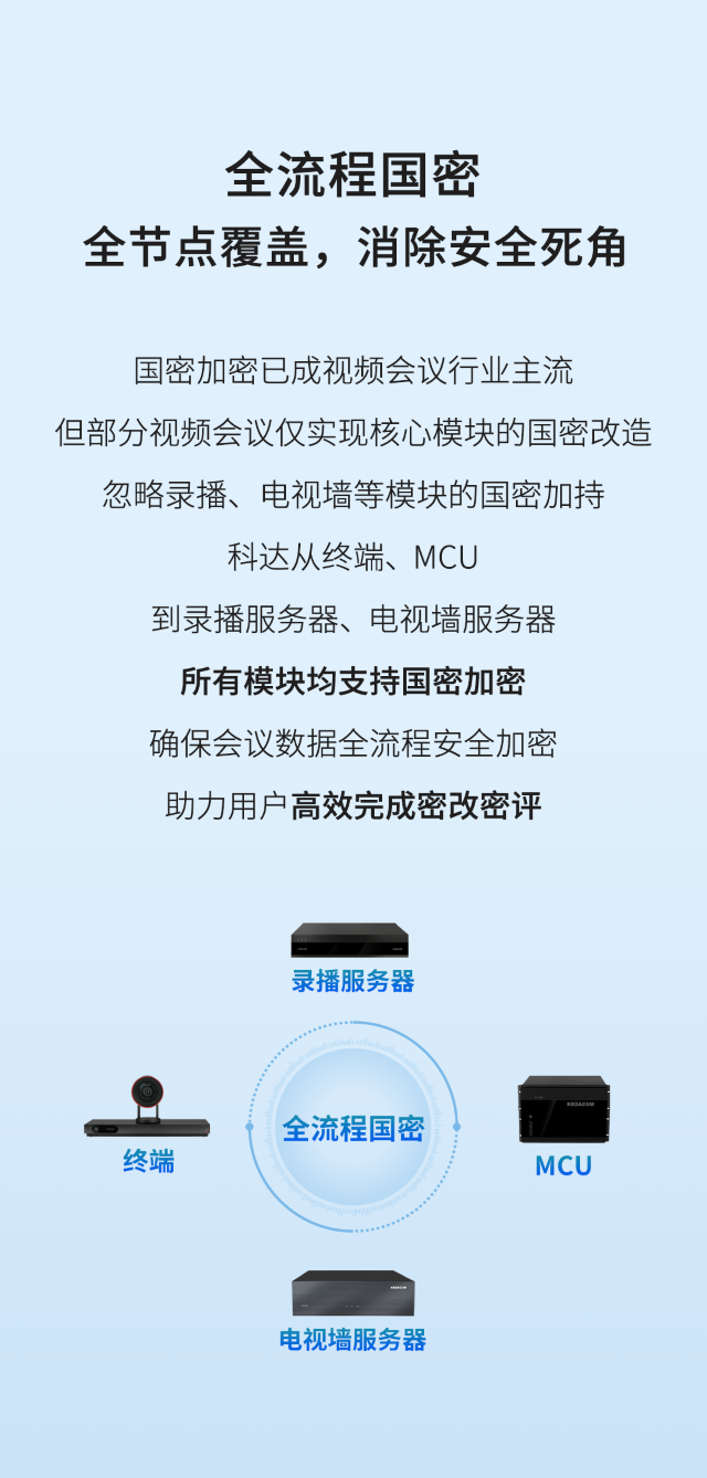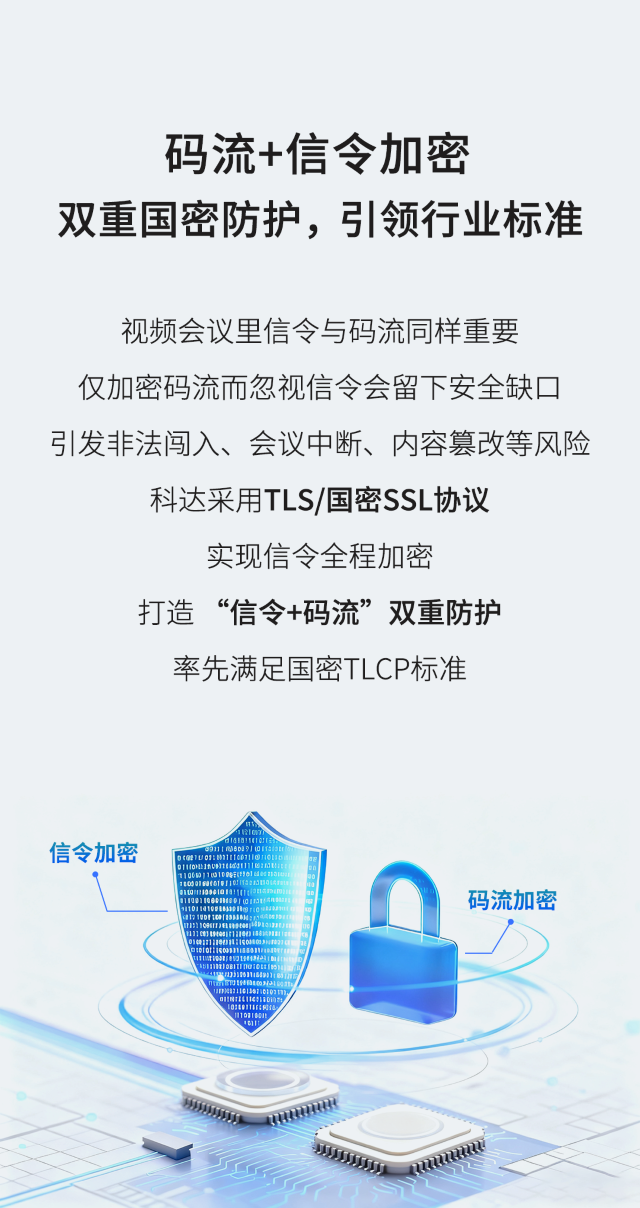 在众多网络安全应用场景中,视频会议系统的安全至关重要,其关乎政企、金融、医疗等行业信息交流的保密性、完整性与可用性。科达基于多年行业实践,构建起覆盖端到端的八大安全壁垒,为视频会议打造全链路防护体系。