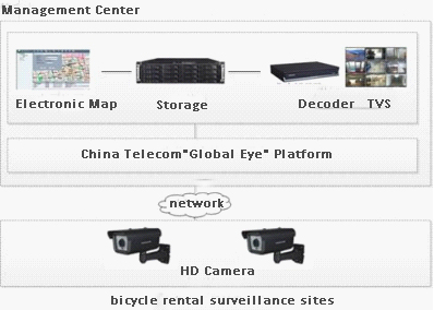 By leasing the "Global Eyes" surveillance platform jointly deployed by China Telecom and Kedacom, the administration is able to achieve city-wide high-definition video surveillance and integration, storage and playback, alarm monitoring at every bicycle rental station. "Global Eye" video surveillance is a broadband network-based value-added service on remote transmission and management of images.